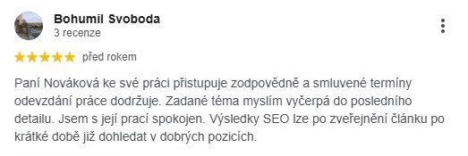 "Díky Jarce jsem pochopila, co to SEO je jaký má význam pro nalezení stránek na Googlu na základě klíčových slov. Jednoduše a srozumitelně mi vysvětlila, proč je SEO tak důležité a jak může ovlivnit mé podnikání. S maximální trpělivostí, tolerancí a ochotou mě provedla rok za krokem všemi stránkami mého webu, včetně podrobného postupu, jak SEO realizovat. Jarku vřele doporučuji jako konzultantku v této oblasti, protože dokáže i technicky nezkušeným lidem vysvětlit, jak SEO u jednotlivých stránek webu nastavit, aby je klienti, kteří hledají informace na Googlu, dobře našli. Jarce patří velký dík!"